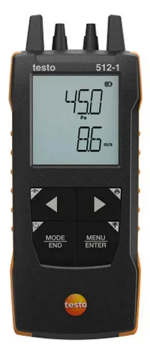 Testo 512-1 — это цифровой дифференциальный манометр с диапазоном измерения от 0 до 200 гПа, созданный для настройки и диагностики вентиляционных систем. По сравнению с предыдущими моделями, он имеет улучшенную конструкцию корпуса, уменьшенные размеры и встроенный модуль Bluetooth. В отличие от модели 512-2, данный манометр обладает увеличенным разрешением и дополнительными функциями, такими как контроль перепадов давления и измерение скорости воздушных потоков с трубкой Пито (приобретается отдельно).
